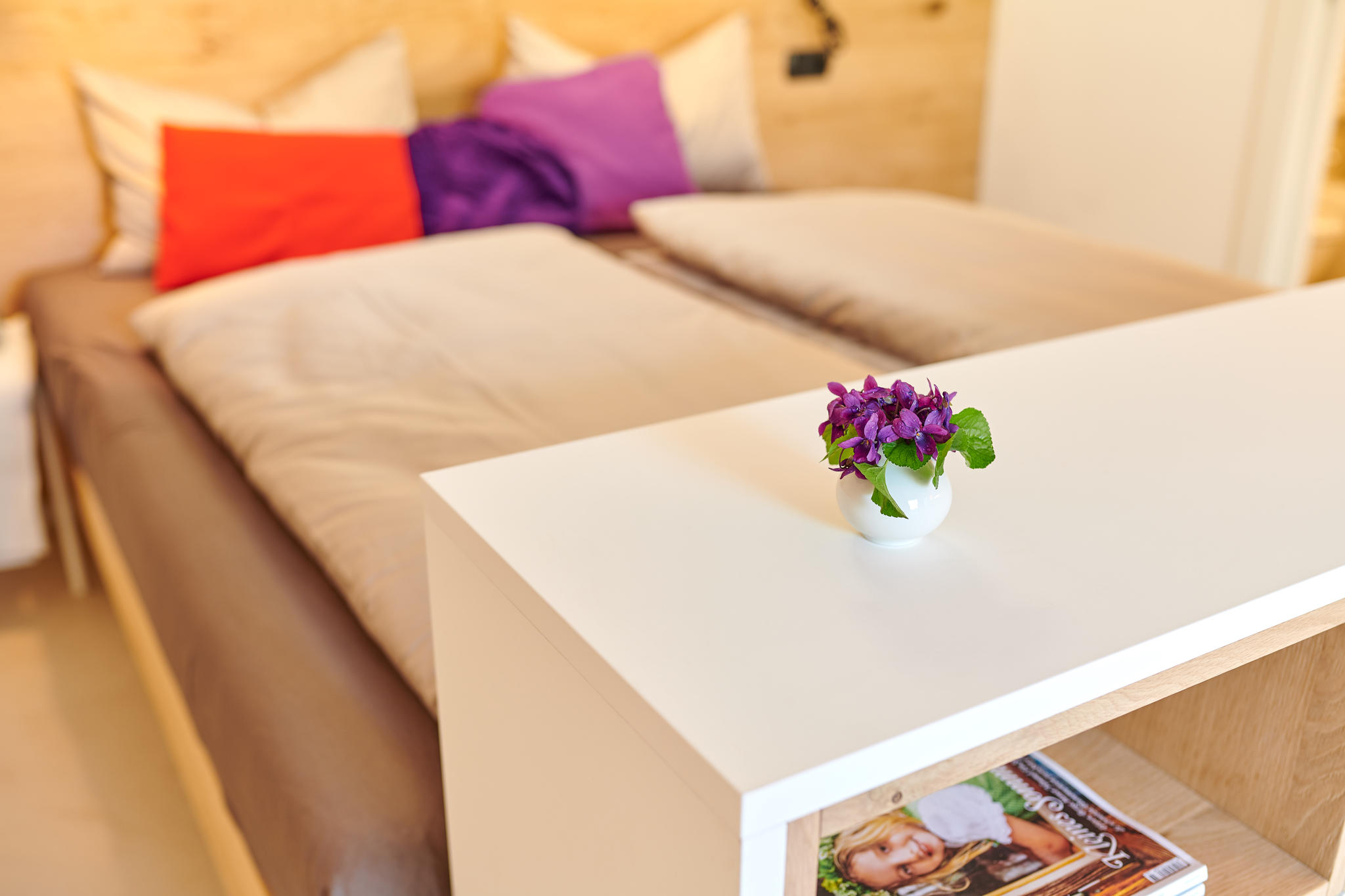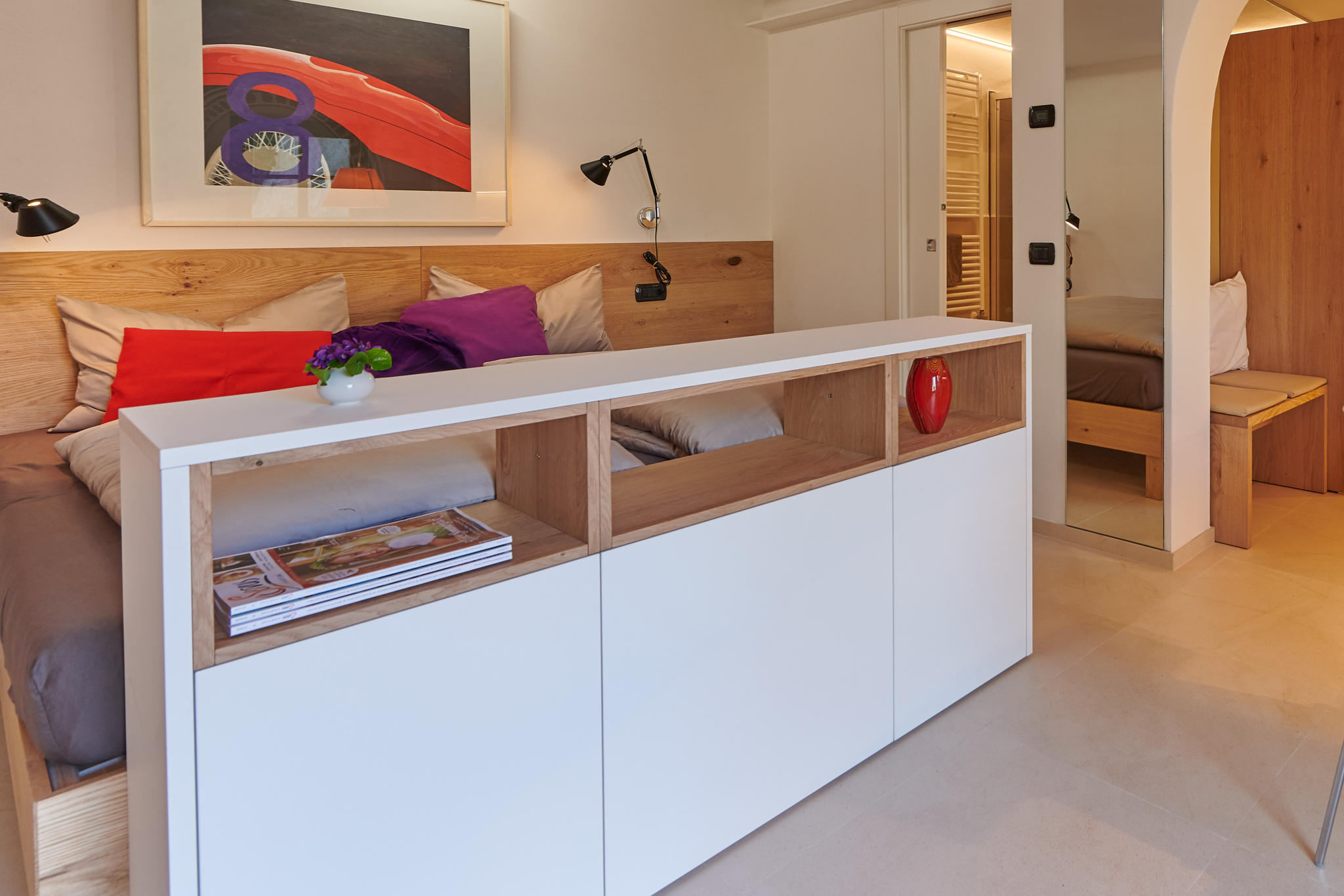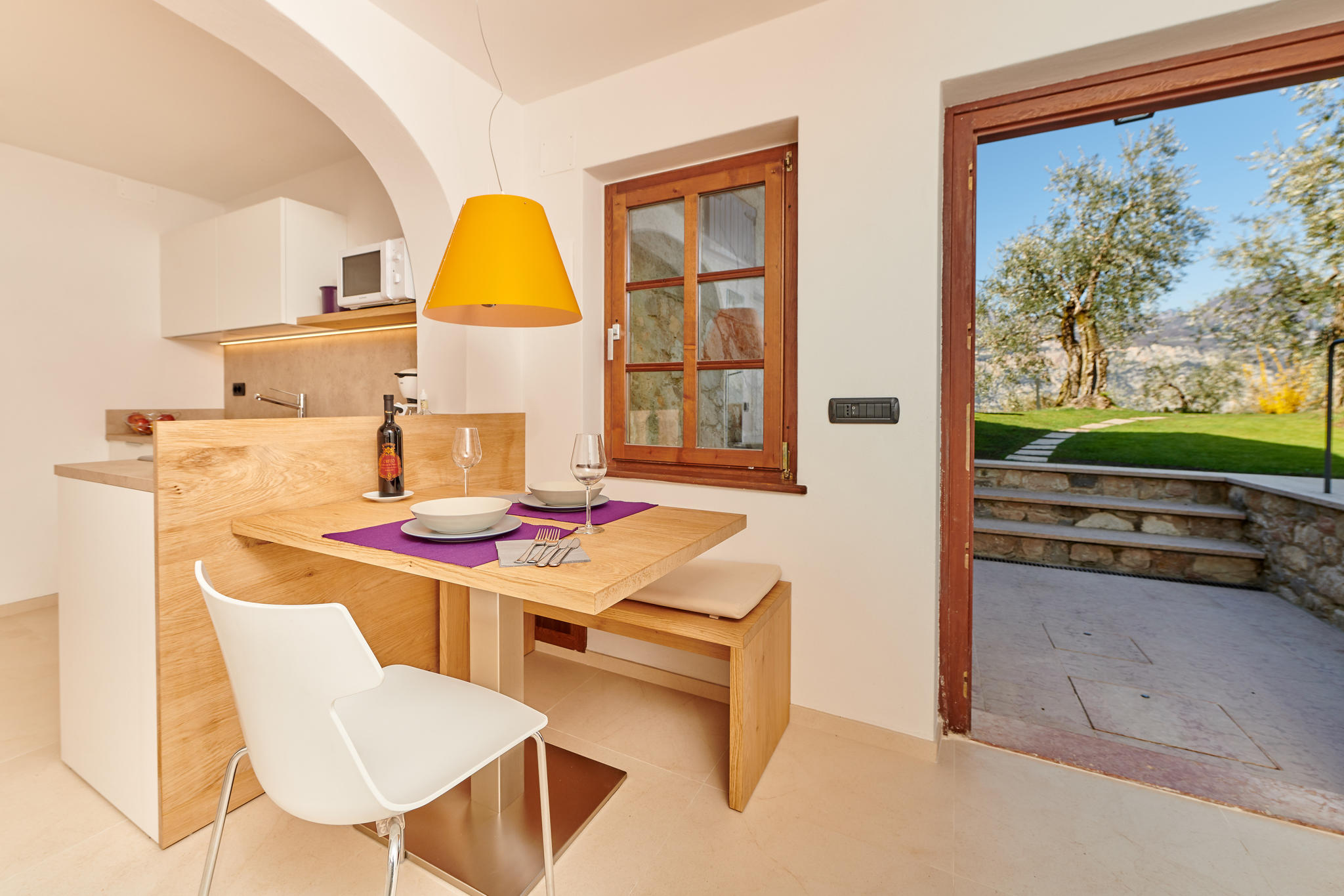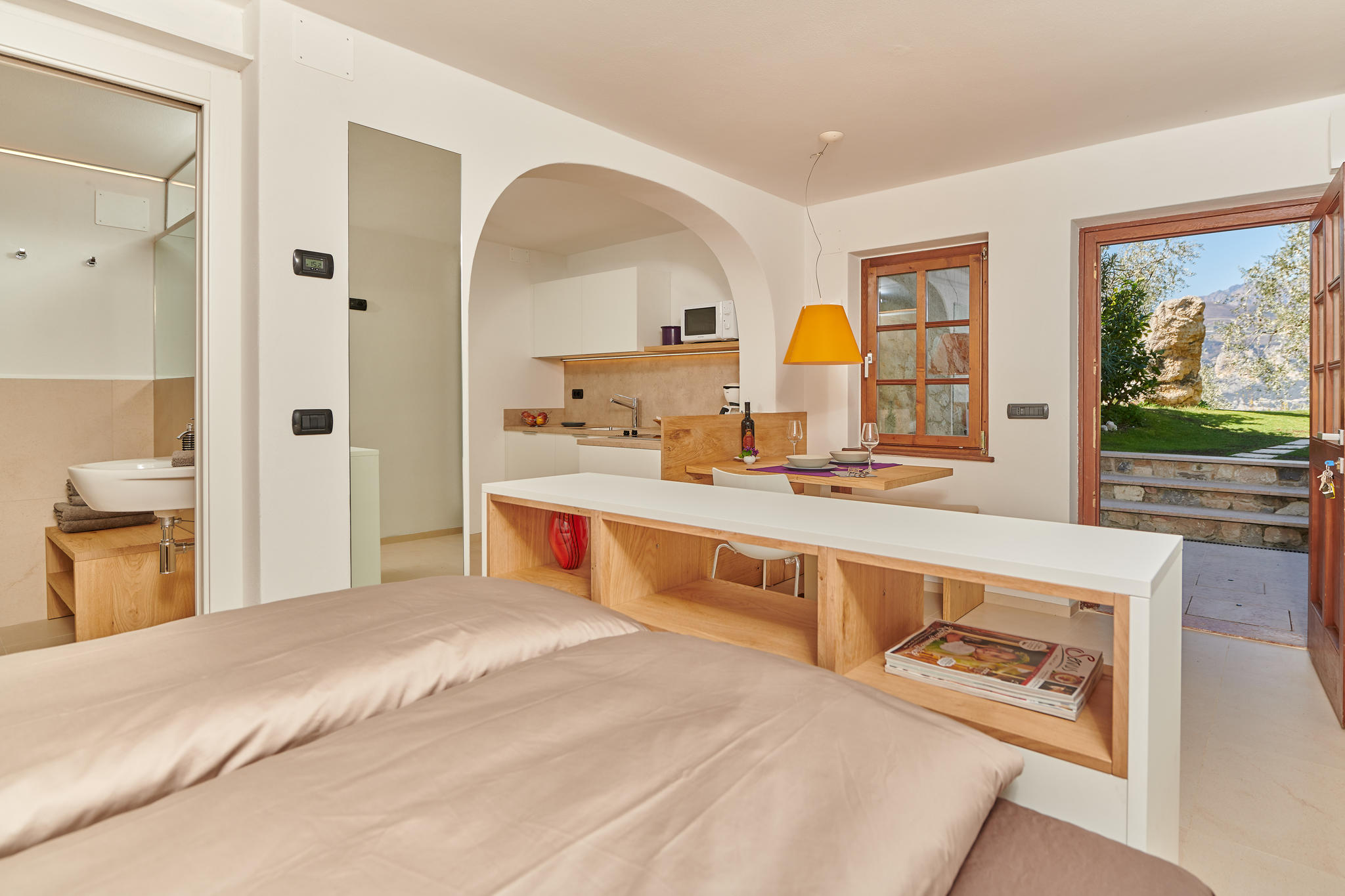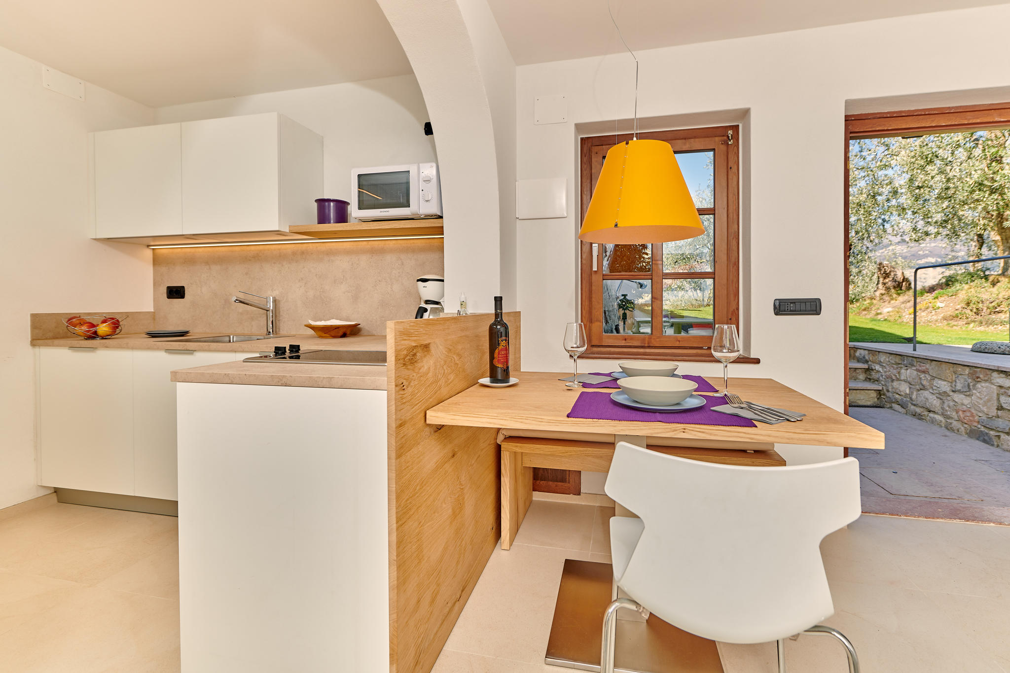 Neu umgebaut und gestaltet, hat ca. 28 m² Wohnfläche und 15 m² Terrasse mit Seeblick und Liegewiese. Es umfasst einen Raum mit Doppelbett, ein Bogen verbindet ihn zur Wohnküche hin, die komplett (Kaffeemaschine, Mikrowellenrohr und Geschirr) eingerichtet ist. Es ist mit Fernseher (SAT Empfang) und Internetanschluss (Wi-Fi) ausgestattet und kann auch im Winter bewohnt werden, da zentral beheizt. Im Bad ist WC, Bidet, Dusche und Föhn.